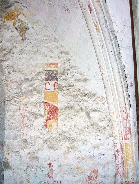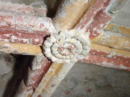 Les nervures de la croisée d’ogives sont décorées part une alternance de couleurs ocre-jaune et ocre-rouge, un filet noir enserré dans un filet blanc imite précisément les joints des claveaux. Sur les faces latérales, des motifs de feuilles stylisées avec nervures vertes et noires sont peints avec une grande minutie.