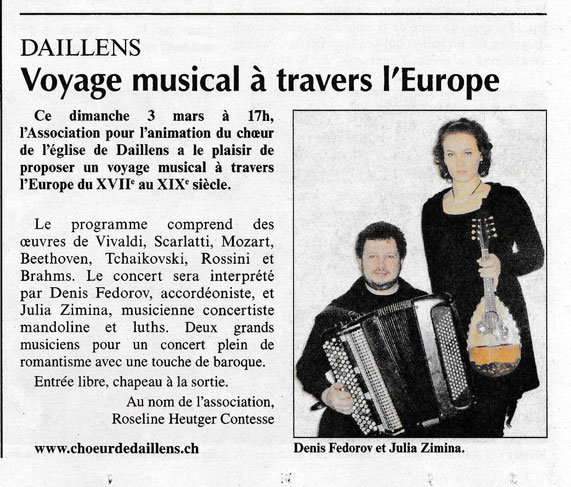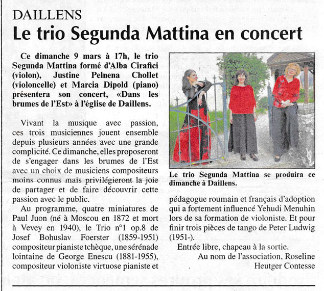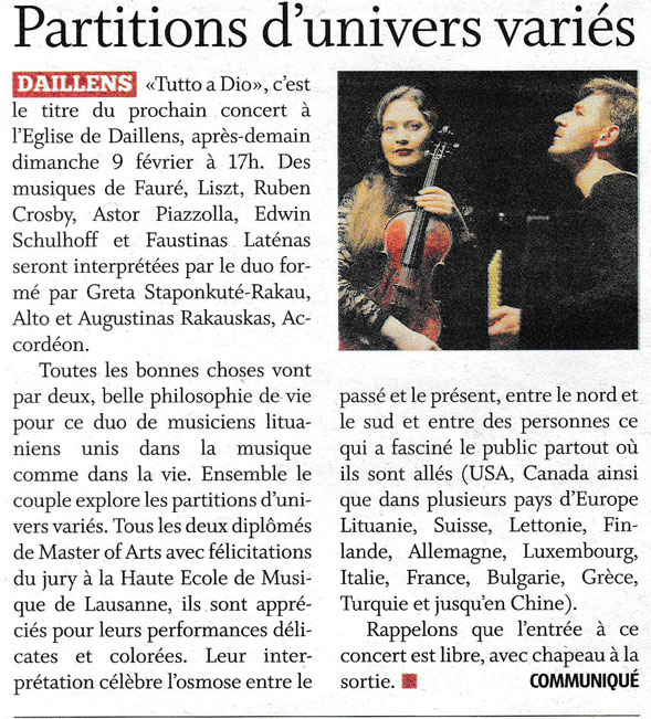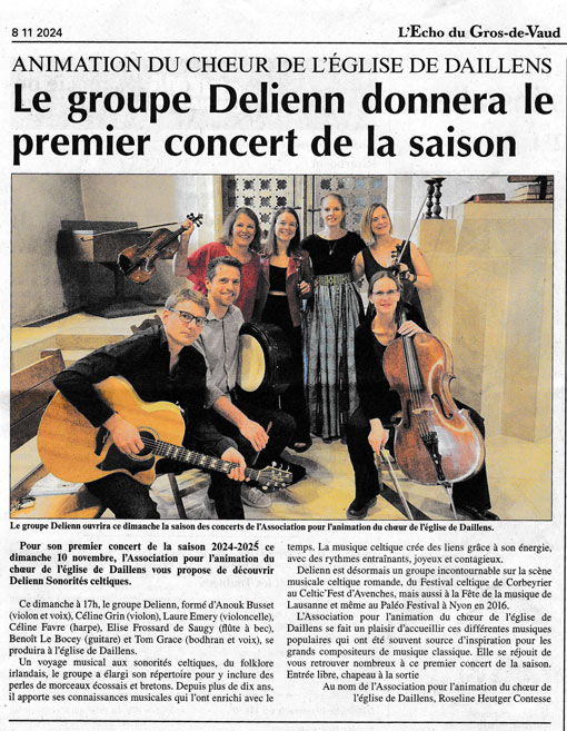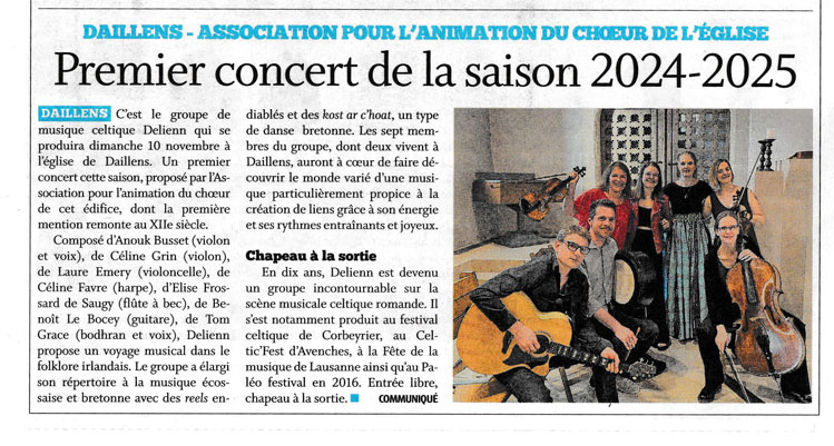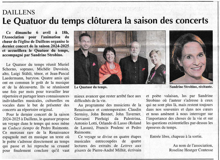 Ce dimanche 6 avril à 18h, l'Association pour l'animation du chœur de l'église de Daillens organise le dernier concert de la saison 2024-2025 et accueillera le Quatuor du temps, accompagné par Sandrine Strobino.