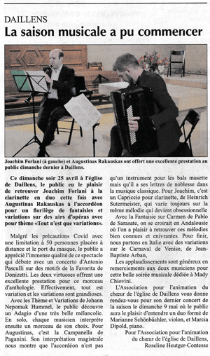 Ce dimanche soir 25 avril à l'église de Daillens, le public eu le plaisir de retrouver Joachim Forlani à la clarinette en duo cette fois avec Augustinas Rakauskas à l'accordéon pour un florilège de fantaisies et variations sur des airs d'opéras avec pour thème «Tout n'est que variations».