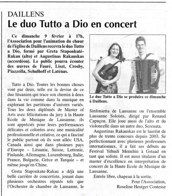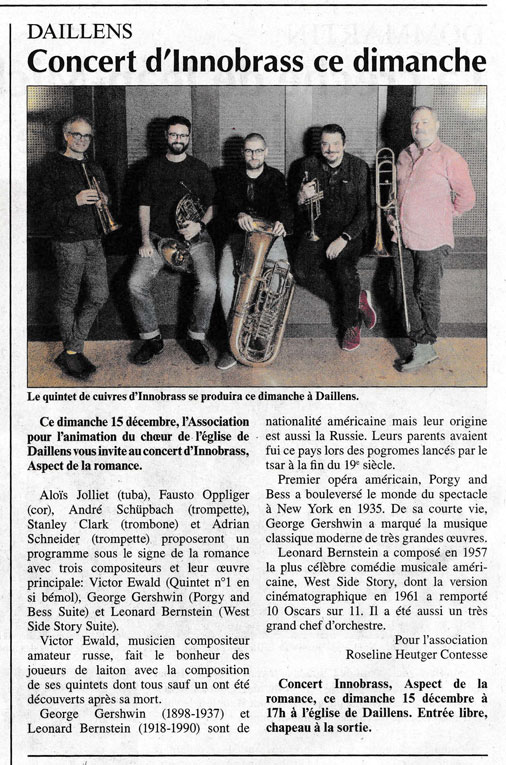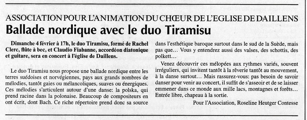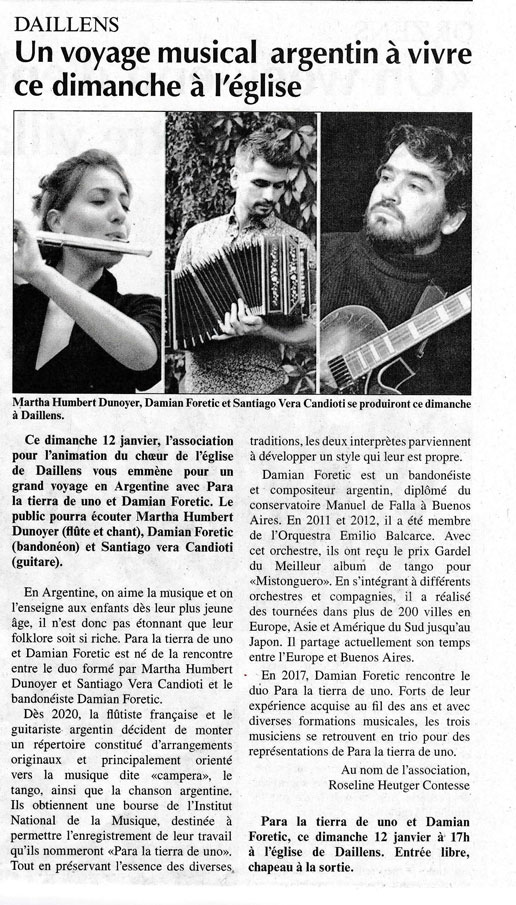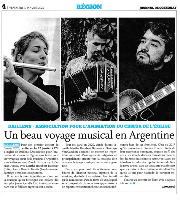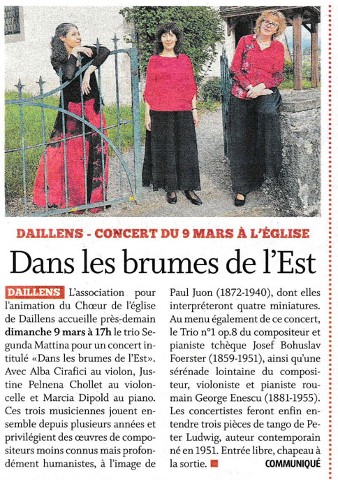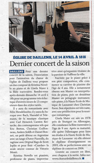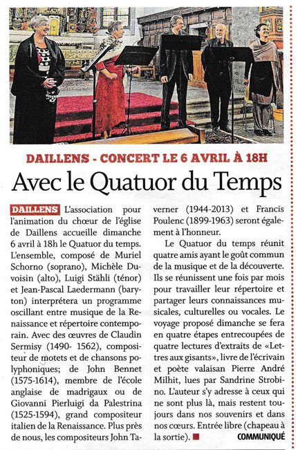 Ce dimanche 6 avril à 18h, l'Association pour l'animation du chœur de l'église de Daillens organise le dernier concert de la saison 2024-2025 et accueillera le Quatuor du temps, accompagné par Sandrine Strobino.