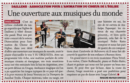 Pour son premier concert de la saison, l’Association pour l’animation du Chœur de l’église, dans son désir d’offrir une ouverture aux musiques du monde, avait le plaisir d’accueillir le trio Y SU ORQUESTA.