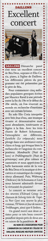 Dimanche passé s’est tenu un excellent concert de Béa Droz, soprano et Elio Coria, piano, à l’église de Daillens
