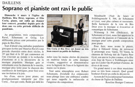 Dimanche 6 mars à l’église de Daillens Béa Droz, soprano et Elio Coria, piano, ont enfin pu donner leur concert, peaufiné depuis près de deux ans vu cette période difficile de pandémie.