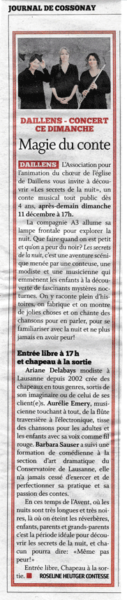 L'Association pour l'animation du chœur de l'église de Daillens Vous invite à découvrir .«Les secrets de la nuit», un conte musical tout public dès 4 ans, après-demain dimanche 11 décembre à 17h.
