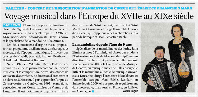 L'Association pour l'animation du cœur de l'église de Daillens invite le public à un voyage musical à travers l'Europe du XVIle au XIXe siècle. Avec l'accordéoniste Denis Fedorov et la spécialiste de la mandoline Julia Zimina.