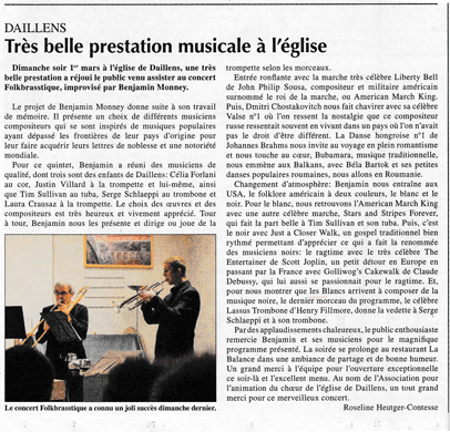 Dimanche soir 1er mars à l’église de Daillens, une très belle prestation a réjoui le public venu assister au concert Folkbrasstique, improvisé par Benjamin Monney.